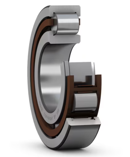 Os rolamentos de rolos cilíndricos de uma carreira são projetados para suportar cargas radiais elevadas em conjunto com altas velocidades. Com dois flanges integrais no anel externo e um flange no anel interno, os rolamentos modelo NJ podem suportar deslocamento axial em uma direção. Uma característica importante é o modelo separável, que facilita a montagem e permite que os componentes do rolamento sejam trocados.